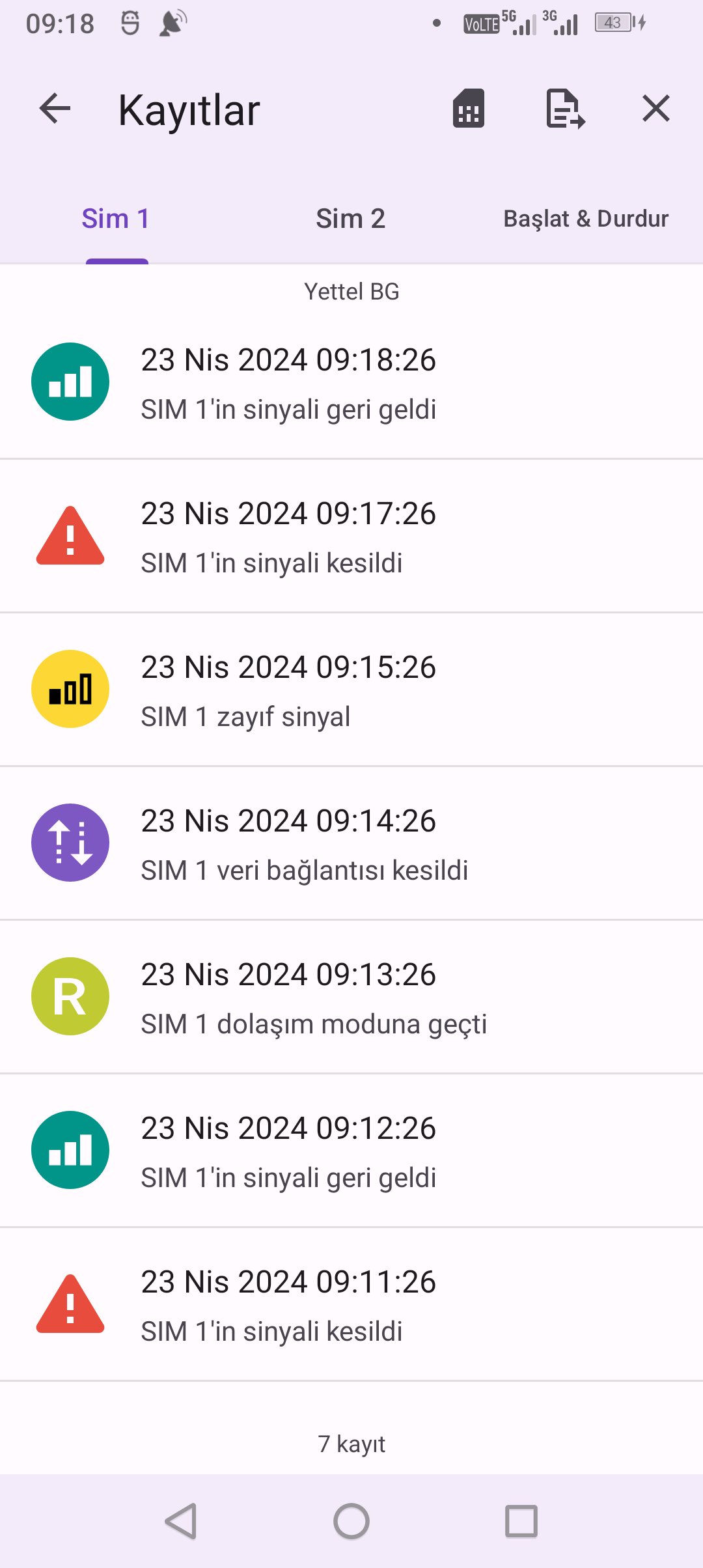 GSM Sinyal Monitörü sinyalle ilgili her olayı bildirim günlüğüne kaydeder. Günlüğe sinyal kaybolması, geri gelmesi, azalması, mobil veri kaybolması ve dolaşımın etkileştirilmesi gibi olaylar kaydedilir. Kayıtlar CSV, PDF ve HTML formatlarında dışa aktarılabilir.