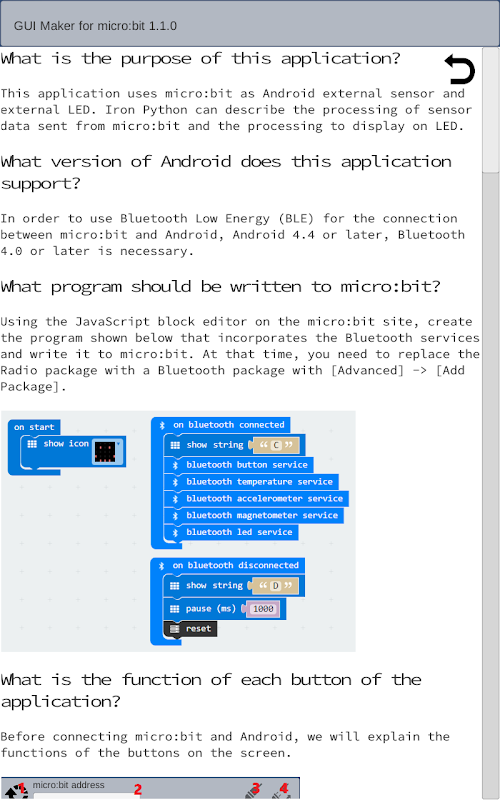 This application uses micro:bit as Android external sensor and external LED. Iron Python can describe the processing of sensor data sent from micro:bit and the processing to display on LED.