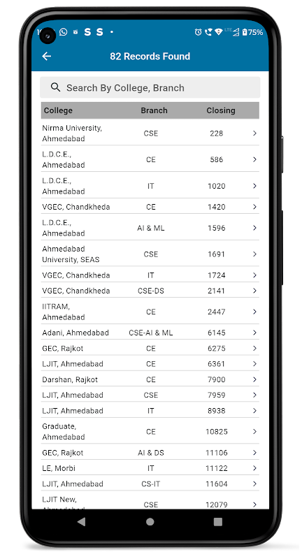 » Arama Kesimi - Liyakat sıralaması, kategori (açık, sebc, sc, st, ews, tfws), üniversite türü (gov. \ sfi), şehir vb. temel alınarak kapanış başarı numarasına sahip kolejlerin listesi. Ayrıca boş kontenjanlar ve çevrimdışı tur verilerini de gösterir.