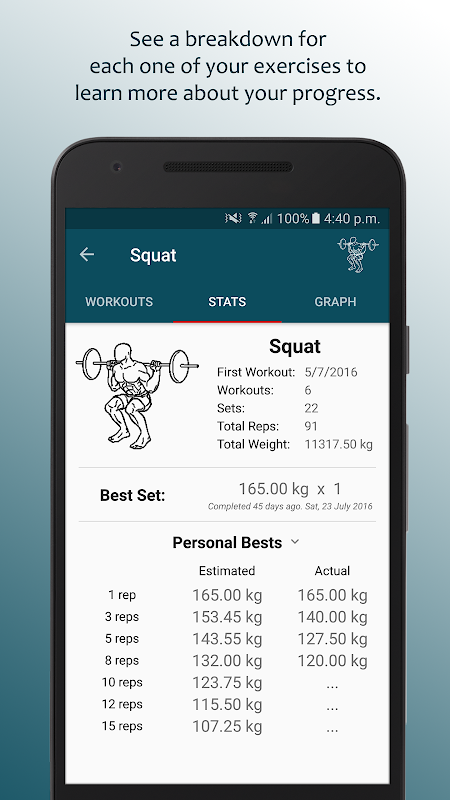 - Ayrıntılı istatistikler sayfası size en iyi setinizi, kaç antrenman yaptığınızı, tahmini bir maksimum tekrarınızı ve çok daha fazlasını söyleyecektir.