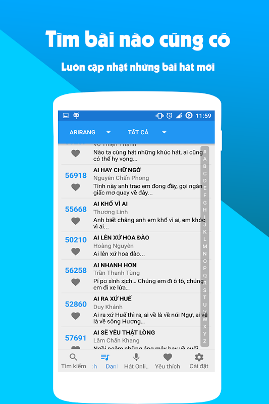 Mã số karaoke việt nam là phần mề hát karaoke vn free 100%. Hát karaoke qua Mã số bài hát karaoke việt nam của các đầu thu như: Karaoke arirang 5 số, California 6 số, Music core 5 số, VietKTV 6 số. Với tính năng tìm kiếm nhanh và chính xác giúp bạn có thể tìm kiếm nhanh một bài hát chỉ mất chưa đầy 1 giây mà bạn không phải chờ quá lâu.