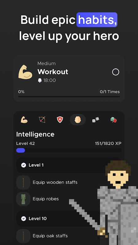 Karakterinizi yaratın ve özelleştirin, ardından bağlı kalmak istediğiniz alışkanlıklar yaratın. Bir alışkanlığı tamamladığınızda karakteriniz için XP, altın ve bazen de öğeler alacaksınız!