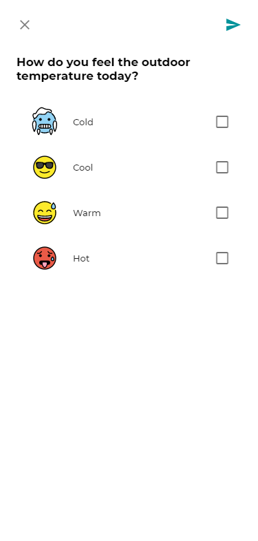 1. Bulunduğunuz yerdeki mevcut hava kalitesini ve dış ortam sıcaklığını nasıl hissettiğinizi belirtebilir ve diğer kullanıcıların mevcut koşulları anlamasına yardımcı olabilirsiniz.