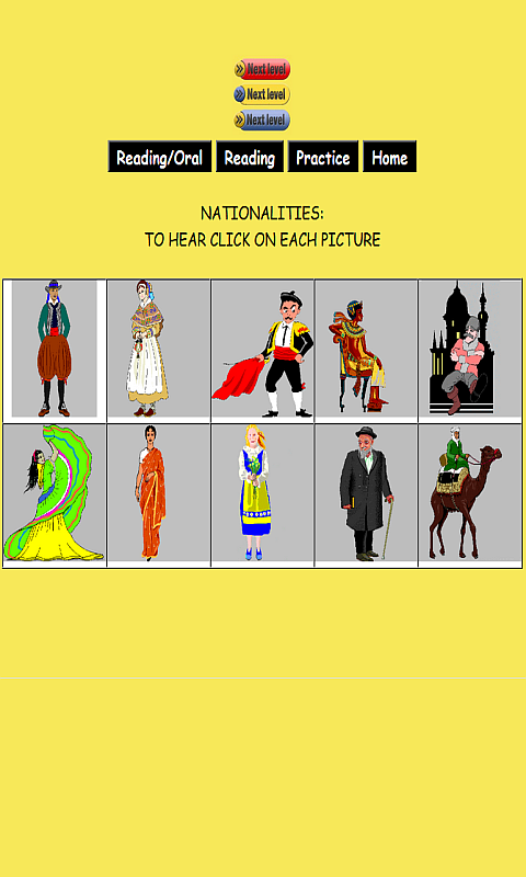 Proceed to read vocalized text with accompanied the flag. Proceed to read non-vocalized text. Proceed to simple nominal phrase with nationality as a predicate, learn to use short phrase with different nationalities, learn to distinguish between masculine and feminine, plural and singular genus in nationalities.