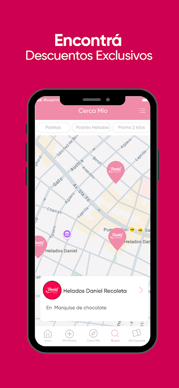 "Buraya yakın", yakınınızdaki kuponları ve tüm Daniel Dondurma mağazalarını görmenizi sağlar.