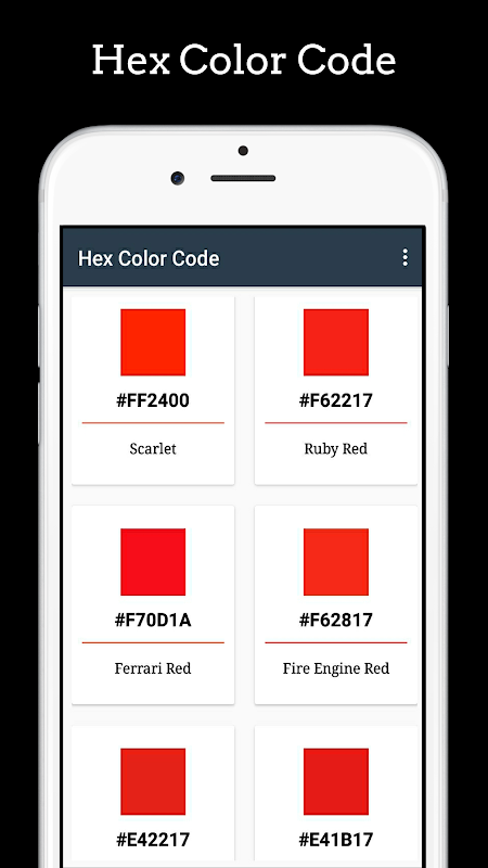 Hex Color Code, Web Designer, Mobile Designer gibi Renkli Tasarımların tasarım şablonları için farklı renk kodlarına ihtiyaç duyduğu basit kullanıcı arayüzüne sahip güzel bir uygulamadır.