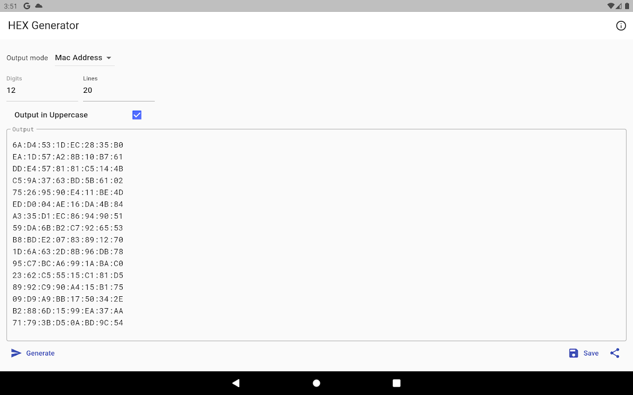 MAC adresi ve GUID dahil olmak üzere 3 farklı tür oluşturma yeteneğine sahip basit altıgen dizi oluşturucu. Çıktı küçük ve büyük harf olarak üretilebilir