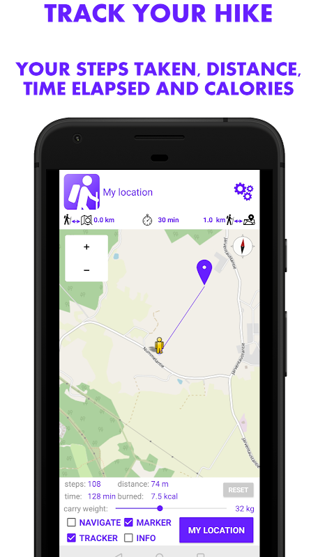 🧭 Marker Custom marker which you can place anywhere in the map. The screen tells you how long it takes to walk to the marker and how far it is from your current location. You can use "Navigate" together with this