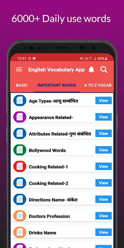 Hintçe'deki bu Çevrimdışı İngilizce Sözlük uygulaması, basit açıklamalar kullanarak günlük yaşam sözcükleri için İngilizce Sözlük'te 50'den fazla konu ile 50000'den fazla Sözlü İngilizce Kelime anlamını kapsar