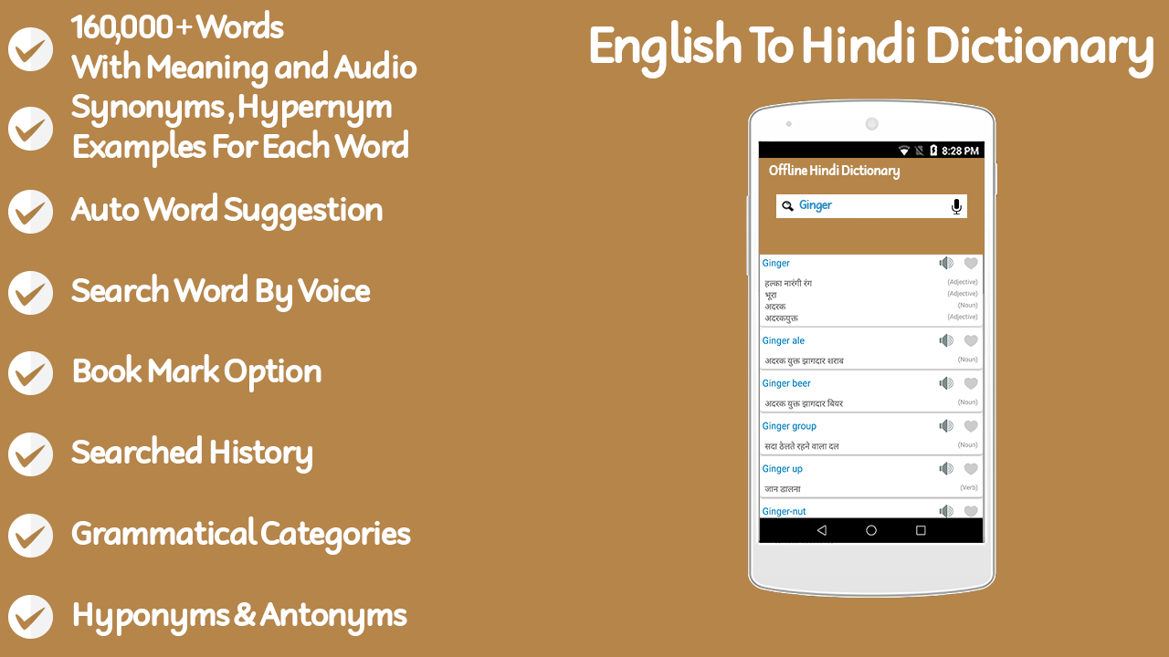 English to hindi dictionary have one lakhs plus word meaning in Hindi and English. This application will help you in building your vocabulary both in English and Hindi. This free dictionary is best offline learning tool. This application have auto words suggestion functionality means you don’t need to type complete word it will show words in suggestion just select your desired word. This application also provide audio pronunciation witch helps in pronouncing correct word in both English and Hindi.