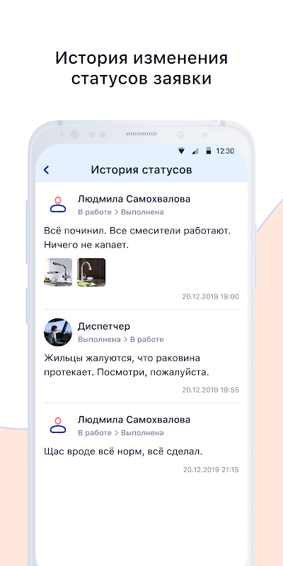4. Başvuruyu raporlayın. Uygulama, işin ilerleyişini hızlı bir şekilde raporlamanıza, uygulamanın durumunu değiştirmenize (yeni, devam eden, tamamlandı), tamamlanan uygulamaları kapatmanıza ve telefondan fotoğraf raporları eklemenize olanak tanır.