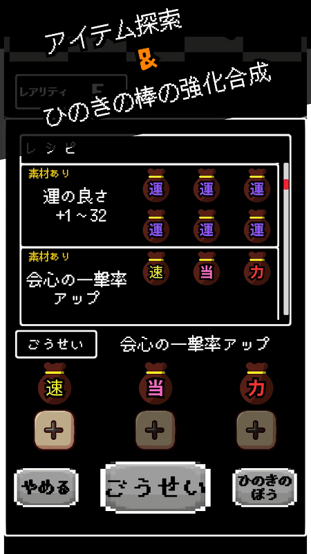 Kahramanla evliliğinizi gerçekleştirmek için hinoki no stick'inizi güçlendirin ve hinoki no stick'inizi güçlendirmek ve kahramanı desteklemek için 101 x 101 boyutunda geniş bir kareye rastgele yerleştirilmiş güçlendirici öğeleri alıp sentezlediğiniz bu yeni silah yükseltme RPG oyununda kahramana yardım edin. Nokta resim dünyasında Şeytan Kral'ı yenin ve kahramanın ve kadın kahramanın aşkını meyveye getirin!