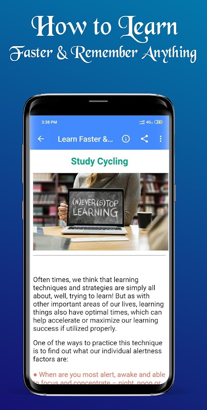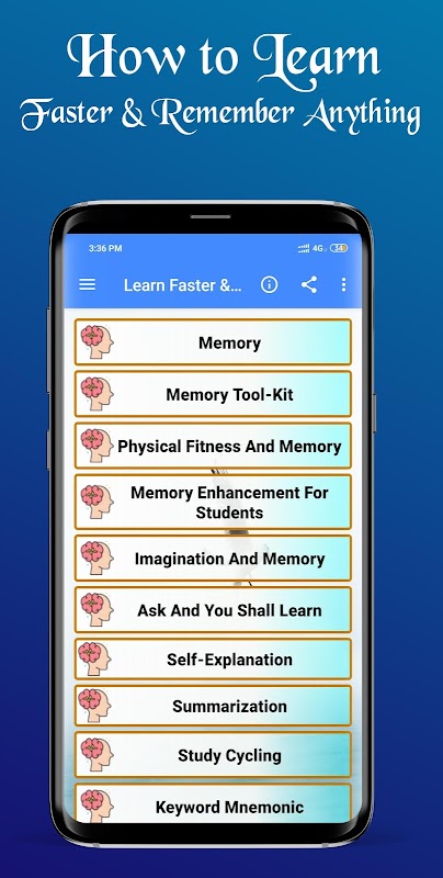 How to Learn Fast & Remember Anything app described and guide that how to learn fast and remember anything. As a human being, the nature of human beings is forgetting anything in a short time. That's why we bring an amazing app (How to Learn Fast & Remember Anything) for you so that you can remember or memorize anything faster or in a short time.