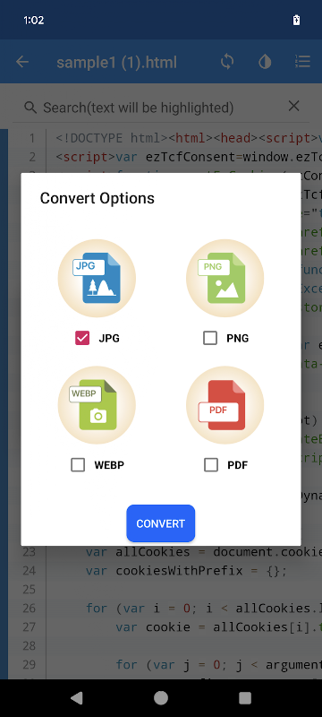 HTML dosyalarını mobil cihazda önizleyin ve JPG, WEBP, PNG ve PDF'ye dönüştürün.