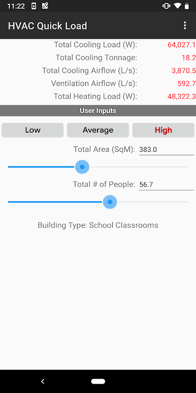 The HVAC Quick Load for Android is the one and only rule-of-thumb HVAC heating and cooling load application for Google Android mobile devices. This app performs rule-of-thumb HVAC cooling and heating load calculations for many types of commercial, industrial, institutional, and residential buildings. It allows you to quickly calculate the total required cooling and heating loads (in BTU/hr or Tonnage) and air flows (CFM or L/s) by inputting just the building type, total square area and number of people.
