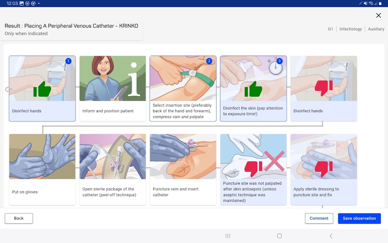 Observe, yorum analizi, NRZ aktarımı, gözlem oranları, çevrimdışı mod, prosedür kaydı ve ulusal kıyaslama gibi 5 anlık izlemenin ötesine geçen birçok ek fonksiyonla el hijyeni için 5 dakikalık uyumun izlenmesine olanak tanır.