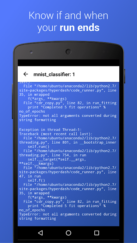 Hyperdash Makine öğrenimi eğitim sürecinin kontrolünü size koymak için mühendisler ve veri bilim adamları tarafından kurulmuştur. Veri bilimi yaşam tarzı, her zaman değil 9-5, ve bu veri fen araçları ne zaman, nerede senin fikir grevler erişilebilir olması gerektiğine inanıyoruz. Biz hızla kullanıcılarımızın sorunlarını çözmek için yeni özellikler geliştirmeye bize görmek istediğinizi bildirin!
