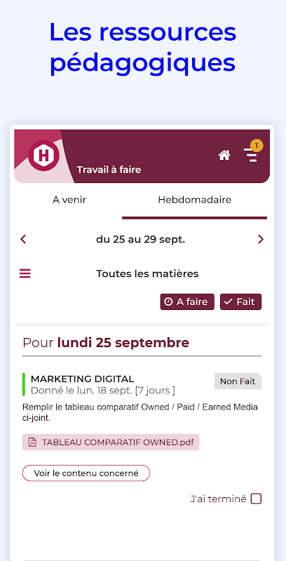 HYPERPLANNING, öğrencilerin ve öğretmenlerin verilerinin gerçek zamanlı olarak ve güvenli bir ortamda erişmelerine izin verir. Öğrenciler her zaman nerede olduklarını bilirler: iptal edilmiş sınıflar, oda değişimi, yapılacak işler, serbest odalar, transkriptler, denetimli ev ödevi, yokluk veya geciktirme. Öğretmenler ihtiyaç duydukları tüm işlevlere günlük olarak erişirler: planlama, sonraki oturumlar, ücretsiz odalar, çağrılar yapılmadı. Çağrı sayfasını doğrudan mobil uygulamadan doldururlar.