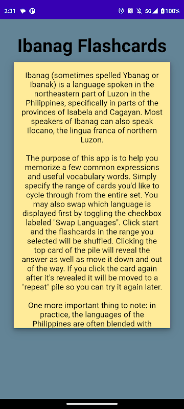 Bu uygulamanın amacı, Ibanag dilinde (bazen Ybanag veya Ibanak olarak da yazılır) birkaç yaygın ifadeyi ve faydalı kelime dağarcığını ezberlemenize yardımcı olmaktır. Uygulamayı kullanmak için, tüm setten hangi kart aralığını kullanmak istediğinizi belirtmeniz yeterlidir. Ayrıca, "Dilleri Değiştir" onay kutusunu işaretleyerek önce hangi dilin görüntüleneceğini de değiştirebilirsiniz. "Başlat"a tıkladığınızda, seçtiğiniz aralıktaki bilgi kartları karıştırılacaktır. Destedeki en üstteki karta tıklamak, cevabı ortaya çıkaracak ve aynı zamanda aşağıya doğru hareket ettirerek yoldan çekecektir. Kart açıldıktan sonra tekrar tıklarsanız, daha sonra tekrar deneyebilmeniz için "tekrar" destesine taşınacaktır.