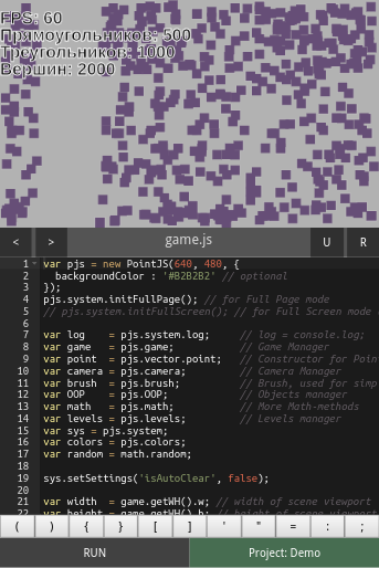 В Android Game Coder вы можете создавать игровые проекты, используя 2D движок PointJS или любой другой.