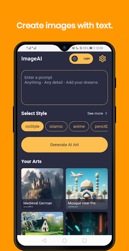 ☆ Metinden Görüntüye Dönüştürme: ImageAI – Art Generator, metin açıklamalarınızı görsel olarak çarpıcı görüntülere dönüştürmek için en son teknoloji derin öğrenme algoritmalarından yararlanır. Fikirlerinizi, konseptlerinizi veya hikayelerinizi yazın ve ImageAI'nin bunları sihirli bir şekilde büyüleyici sanat eserlerine dönüştürmesini izleyin.