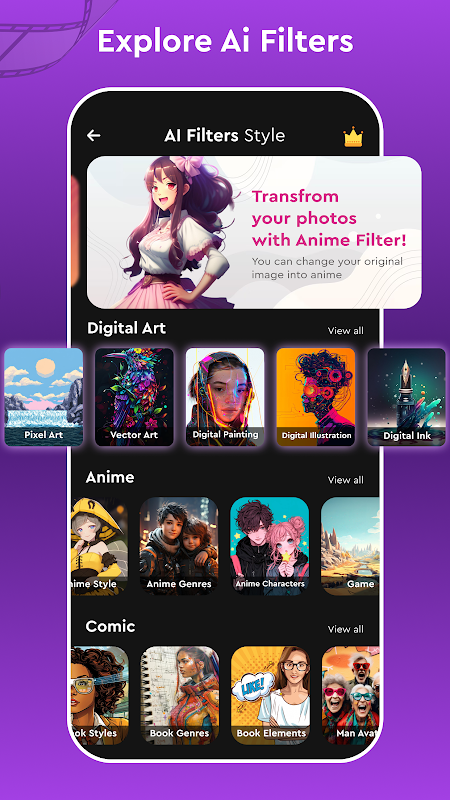 ► AI Filtresi: AI headshot oluşturucunun çeşitli AI destekli filtreleriyle görüntülerinizi geliştirin. Sanatsal stillerden gerçekçi efektlere kadar, AI filtrelerimiz fotoğraflarınızı sayısız şekilde dönüştürmenize olanak tanır. Bir AI profesyonel fotoğrafı oluşturun, kendinizi çizgi filme dönüştürün ve daha birçok filtre.