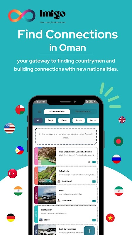Imigo Oman, Umman vatandaşlarını bulmak ve onlarla bağlantı kurmak, yerel etkinlikleri keşfetmek ve çevrenizdeki işletmeleri keşfetmek için başvuracağınız uygulamadır. İster benzer düşüncelere sahip insanlar, topluluk etkinlikleri veya profesyonel fırsatlar arıyor olun, Imigo Umman halkınızla ve kültürünüzle bağlantıda kalmanıza yardımcı olur. Profilinizi oluşturun, güncellemeleri paylaşın ve Ummanlı gurbetçiler ve yerlilerden oluşan destekleyici bir ağa katılın. Bugün Imigo Umman'a katılın ve canlı topluluğun bir parçası olun!