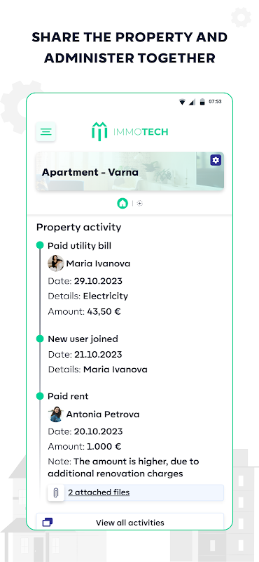 Първата стъпка в Immotech е човек да въведе основни данни за своя имот и да посочи своята роля в него - отдава под наем, живее под наем или живее в собственото си жилище. Потребителят може да покани в приложението хората, с които дели своето домакинство - партньор, родители, съквартиранти; както ve да покани хазяина или съответно наемателя, ако разбира се добавеният в в платформата имот се отдава под наем. Şunları yapın: Şunları yapın: PLATTEN / PLATTEN наем; известяване за налични нови битови сметки ve заплащането им с един клик; намиране на всички търговци, предлагащи дадена услуга директно с интегрирани оценки от Google на хиляди потребители, и изпращане на запитване едновременно до всички търговци. Споделеният календар спомага за следене на всички важни дати и събития в домакинството, както и модулът “Казуси”, чрез който потребителите могат да записват всички належащи задачи по имота си и да коментират прогреса им до постигане на статус “завършен”.