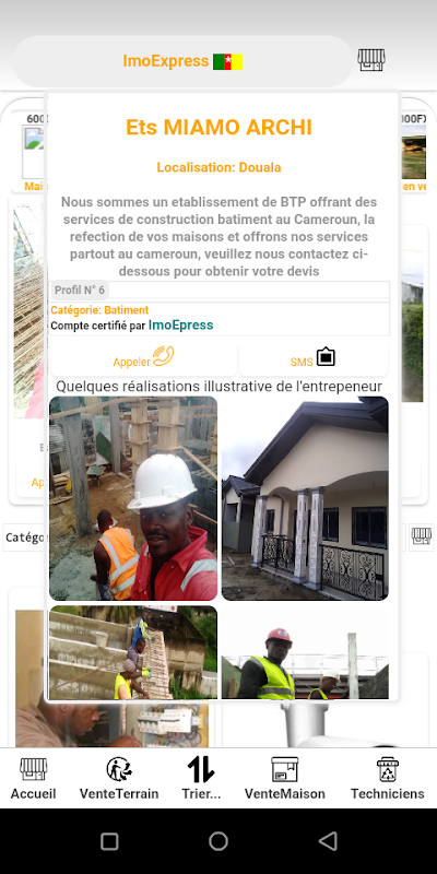Application pour rechercher des maisons à louer et terrains en vente au Cameroun, en cas de besoin au logement , cette application vous permet d'avoir accès au logement facilement , d'obtenir aussi vos techniciens chantier rapidement en cas de besoin.