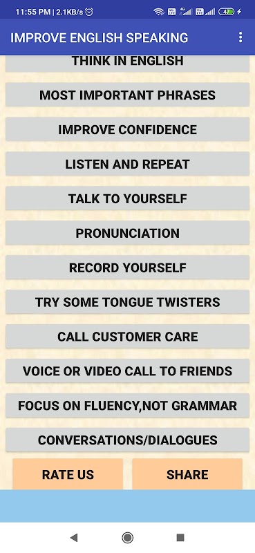 Yukarıdaki ipuçlarını takip ederseniz, İngilizce konuşmayı kolayca geliştirecek, İngilizce konuşma becerilerinizi geliştirecek ve akıcı bir şekilde İngilizce konuşabileceksiniz.Bu android uygulamasının İngilizceyi çok hızlı öğrenmek ve akıcı bir şekilde İngilizce konuşmak için güçlü bir araç olduğunu düşünüyorum.