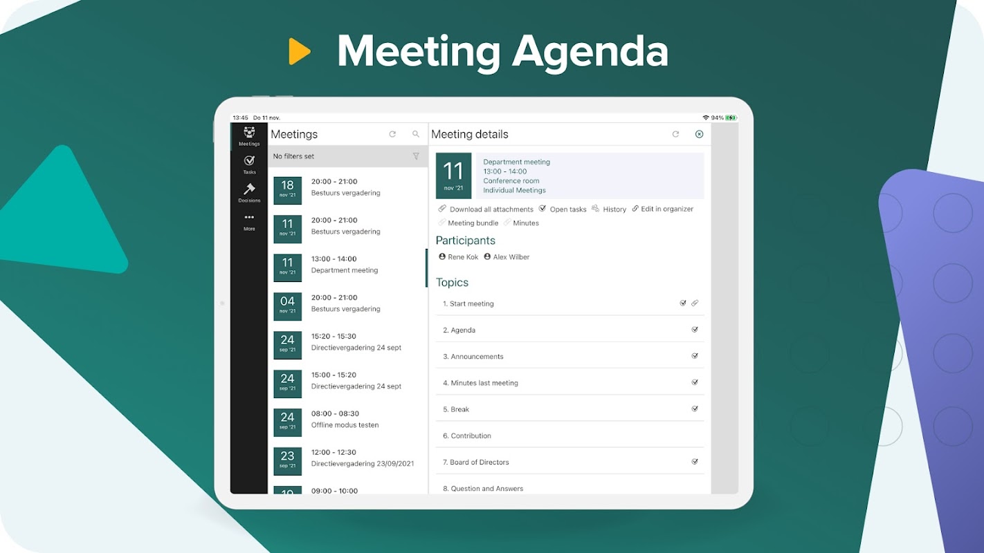 This is the participant app for the Indeqa meeting solution. Indeqa stands for: Simple and efficient; fully digital. Optimal support for secretaries and meeting participants. In which the personal agenda is leading and topics / attachments are always up-to-date. And for anyone participating in any meeting whereever, it offers easy ways to annotate documents and share those with each other. Try this app in demo-mode to discover how it can boost your productivity. Is your organization already using Indeqa ? Sign in to see your own meeting information.