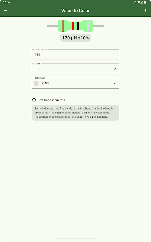 • Renk Değeri Hesaplayıcısı - Eşleşen renk kodu bantlarını gerçek zamanlı olarak görüntülemek için bir endüktans değeri ve tolerans girin.