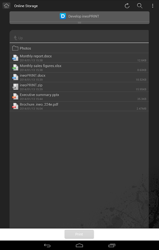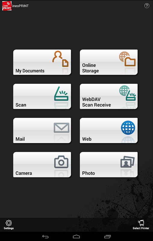 ineoPRINT for Android is an application that allows you to easily connect to DEVELOP printing devices from your Android device using Wi-Fi. It enables you to print documents and images as well as import scanned data.