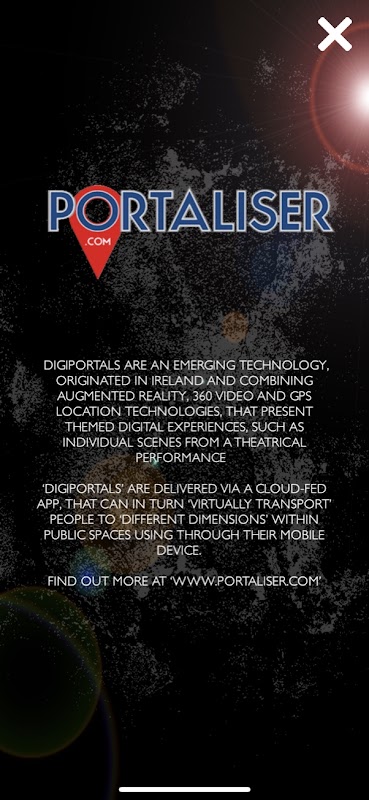 Yeni nesil Portaliser Artırılmış Gerçeklik (AR) teknolojisinin benzersiz bir karışımını, GPS konum yazılımı ve 360 derece surround video ile bir araya getiren kişi, cep telefonunu sanal bir 'Portal' üzerinden 'gezinmek' için kullanır ve ana sahnede kendini bulur. ortaya çıkan eylemin ortasında duracakları Belfast'taki Lirik Tiyatro'dan.