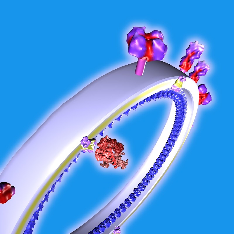 Influenza viruses are about 100 nm in diameter, their outer membrane being the lipid bilayer membrane (elementary cell membrane). On the outer side of the membrane there are glycoproteins, which make the virus stick to the host cell membrane and make it difficult to be recognized by the antibodies. The main glycoprotein here is called Hemagglutinin. It has the shape of a spike, protruding perpendicularly from the viral outer membrane Outer part of this spike searches for the appropriate sugar chains on the host cell membrane and so adheres to the host cell. After the contact is established, the attack on the cell is triggered.