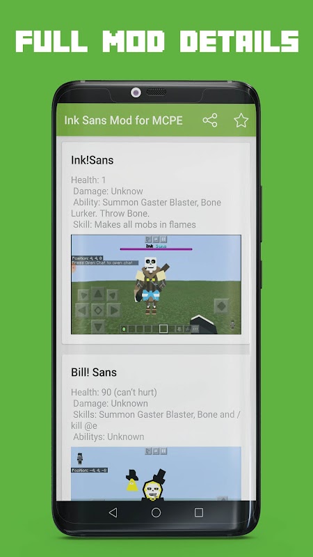 Ink Sans Mod for Minecraft PE, Dust'ı kolayca indirip kurmanıza izin veren bir uygulamadır! Android cihazlarınızda Minecraft Pocket Edition oyununa Ink Sans ile Sans Eklentisi Güncellemesi. Minecraft Modlarını, Eklentilerini, Haritaları, Görünümleri ve Doku Paketlerini yüklemeyi çok kolaylaştıran 1 Tıklamalı yükleyicimiz sayesinde.