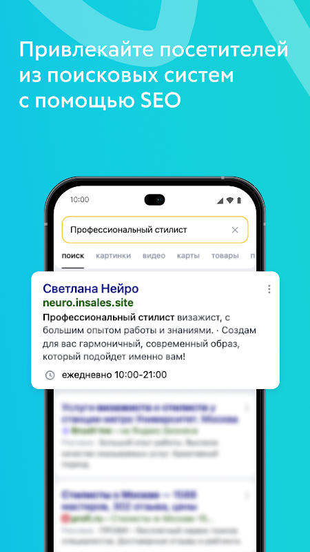 inSales lite'deki site, hızlı bir şekilde çevrimiçi bir işletme başlatmak için ihtiyacınız olan her şeyi içerir. Ürün ve hizmetlerinizi sosyal ağlarda ve anlık mesajlaşma programlarında kolayca paylaşabilir, arama motorlarından, Yandex.Haritalar, 2GIS, Google Haritalar ve diğer yollarla siteye trafik çekebilirsiniz.