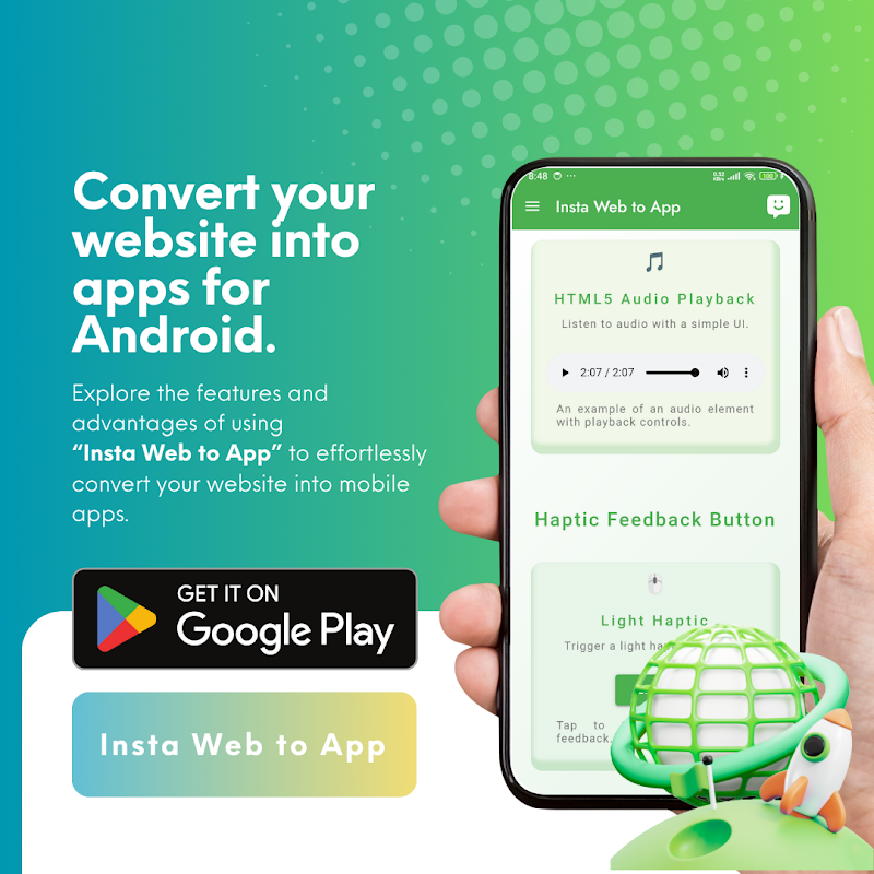 Insta Web to App ile web sitenizi dakikalar içinde tam işlevli bir Android uygulamasına dönüştürün.
