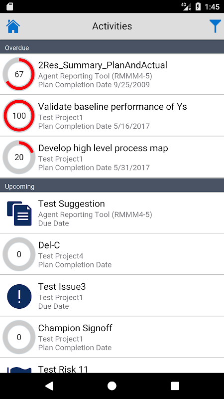 • tüm atanmış İDA etkinliklerini görüntüle. durumu, tam yüzdesini, hurma, süresini ve İDA faaliyetleri için kalan tahmini çaba görmek için her bir etkinlik hakkında dokunun.