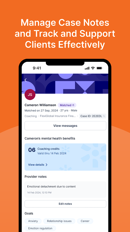 Yaklaşan seansları görüntüleyin, vaka notlarına erişin, ilerlemeyi takip edin ve müşteri etkileşimlerini yönetin – güvenli bir şekilde ve hareket halindeyken.