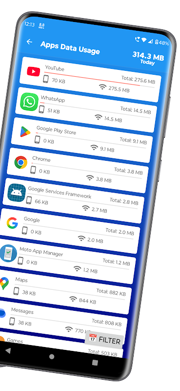 İnternet hızınızı gerçek zamanlı olarak durum çubuğundan ve bildirim panelinden izleyin. Günlük ve aylık veri kullanımınızı (hem Wi-Fi hem de mobil) kolayca ve verimli bir şekilde takip edin.