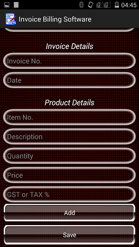 2) Fatura Yapımı: Şirket Ayrıntıları Ekleme sonra sen Fatura Numarası, Tarih, Müşteri detaylarını, Adres ve Ürün detayları Fiyat, Miktar eklemek gerek faturayı hazırlamak için fatura oluşturabilir, Fiyat, Vergi veya GST ve% böylece nihayet Fatura PDF formatında fatura kaydetmek cihazınızın depolama klasörü.