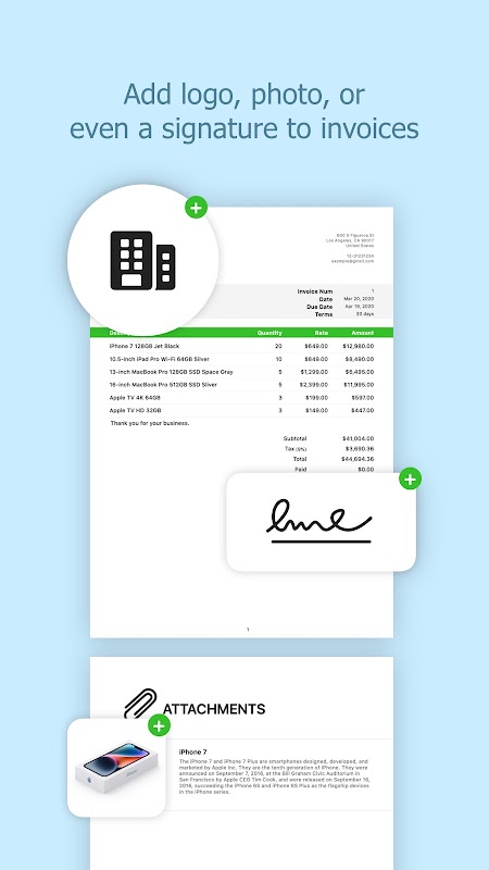 * Faturaları ve tahminleri resim, pdf, e-posta, iMessage vb.Gibi arkadaşlarınızla ve müşterilerinizle paylaşın.