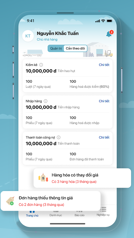Siparişleri, depoları ve borçları yönetmeye yardımcı olan F&B modeli depo yönetimi uygulaması
