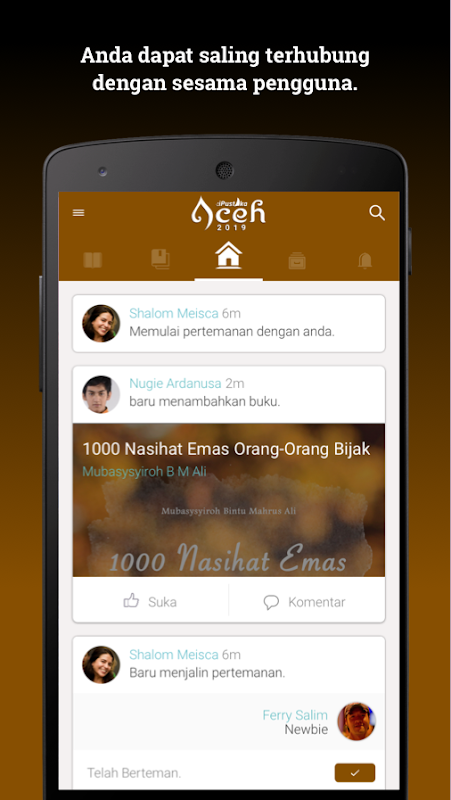 - Besleme: En yeni kitaplar, diğer kullanıcılar tarafından ödünç alınan kitaplar ve diğer çeşitli faaliyetler gibi bilgiler gibi iPustakaAceh kullanıcılarının tüm etkinliklerini görüntülemek için.