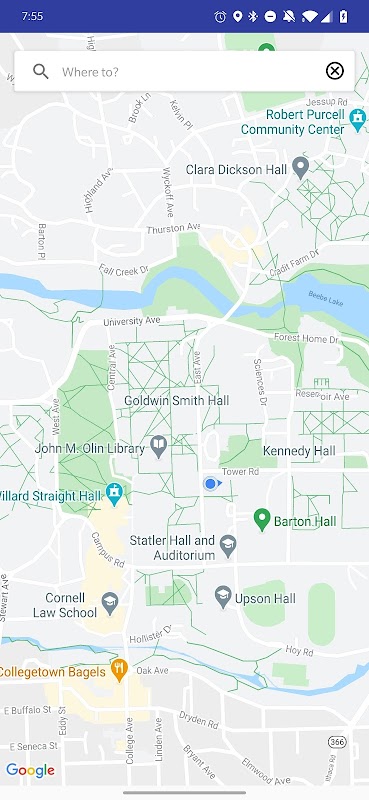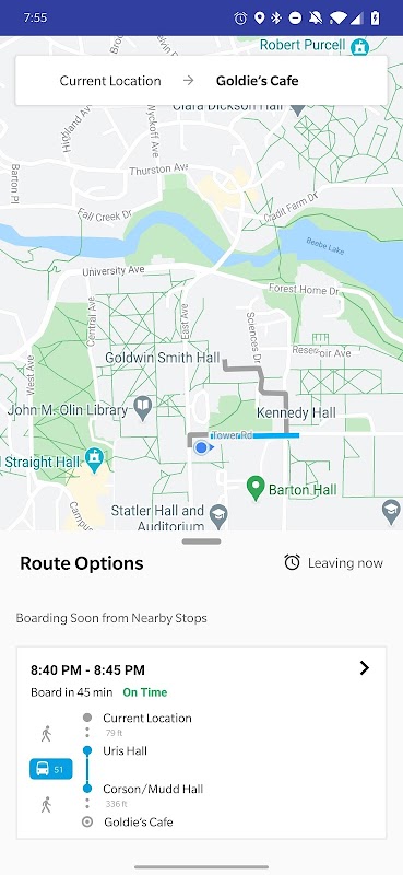 Ithaca Transit integrates with Google Places to allow you to search bus routes to any destination in the country. Search up Chipotle or Waffle Frolic and let the app take care of the rest, including accurate walking directions!