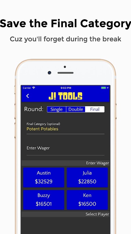 This app helps you quickly track player scores and game results regardless of whether you are playing along with the show or running your own Jeopardy! tournament. You can play any way you want: add, subtract, wager, or just tally; you choose what works for you!