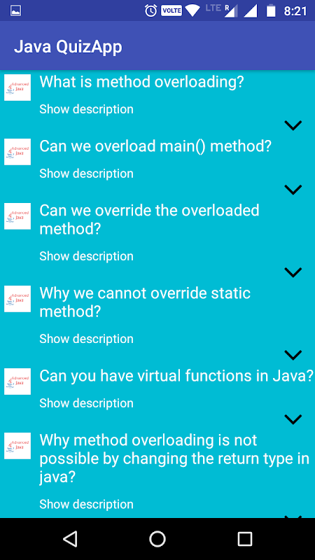Core Java Q & A, sezgisel bir şekilde temsil edilen Yanıtlar ile en sık sorulan Core Java Röportaj Sorularını listeleyen basit bir Android uygulamasıdır.