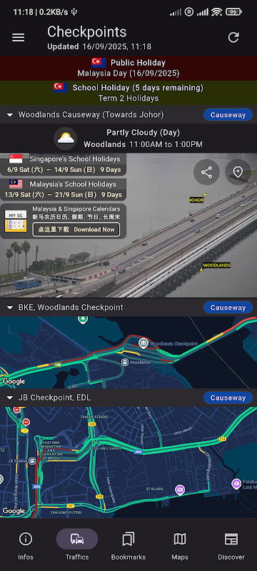 Woodlands Kontrol Noktası ve Tuas Second Link'ten gerçek zamanlı görüntüleri izleyin, böylece gitmeden önce en iyi rotaya karar verebilirsiniz.