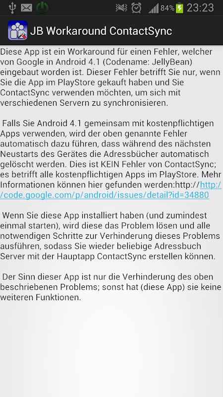 Diese App ist ein Workaround für einen Fehler, welcher von Google in Android 4.1 (Codename: JellyBean) eingebaut worden ist. Dieser Fehler betrifft Sie nur, wenn Sie die App im PlayStore gekauft haben und Sie ContactSync verwenden möchten, um sich mit verschiedenen Servern zu synchronisieren.